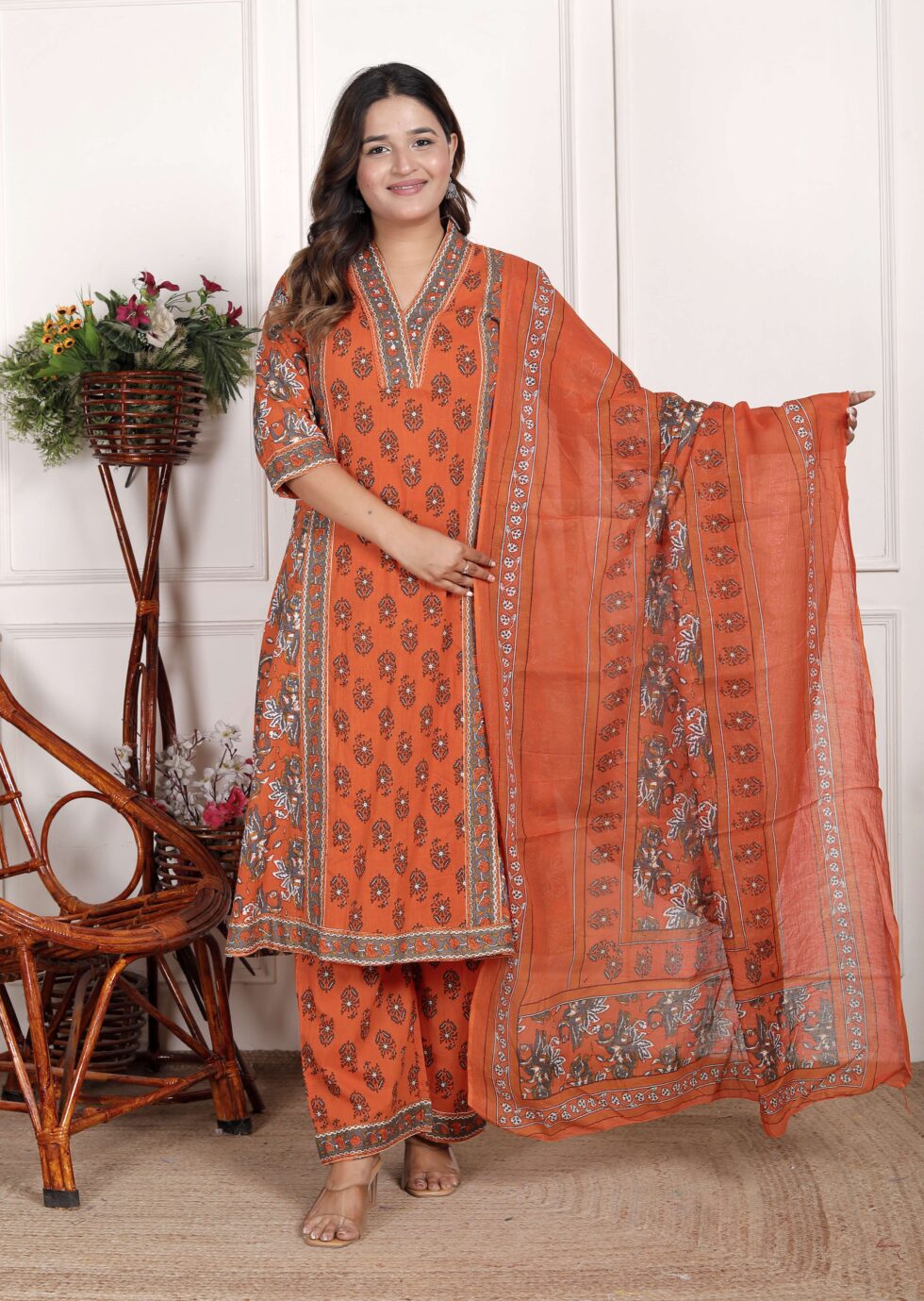 Women’s Cotton Printed Straight Kurti With Pant and Dupatta Set (Orange)