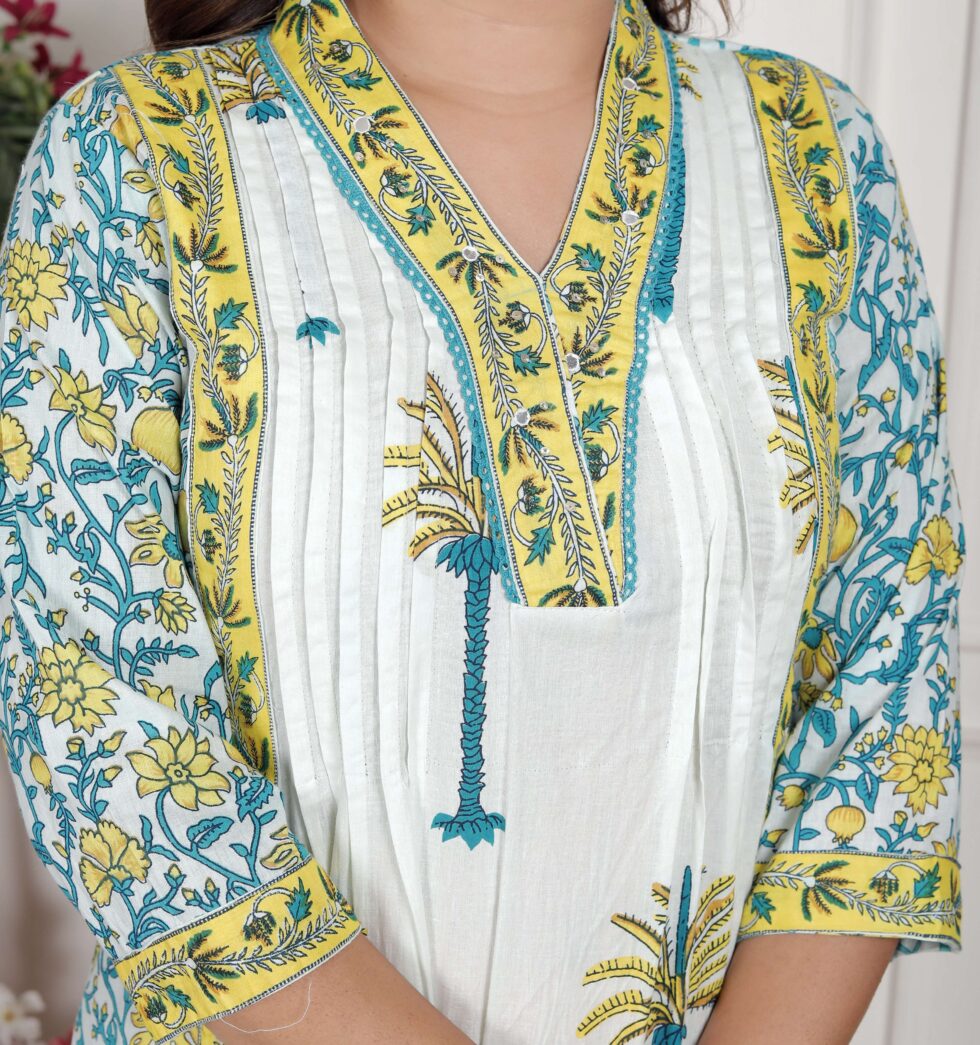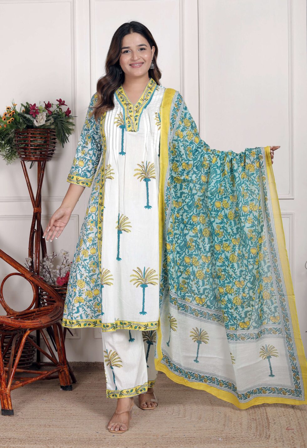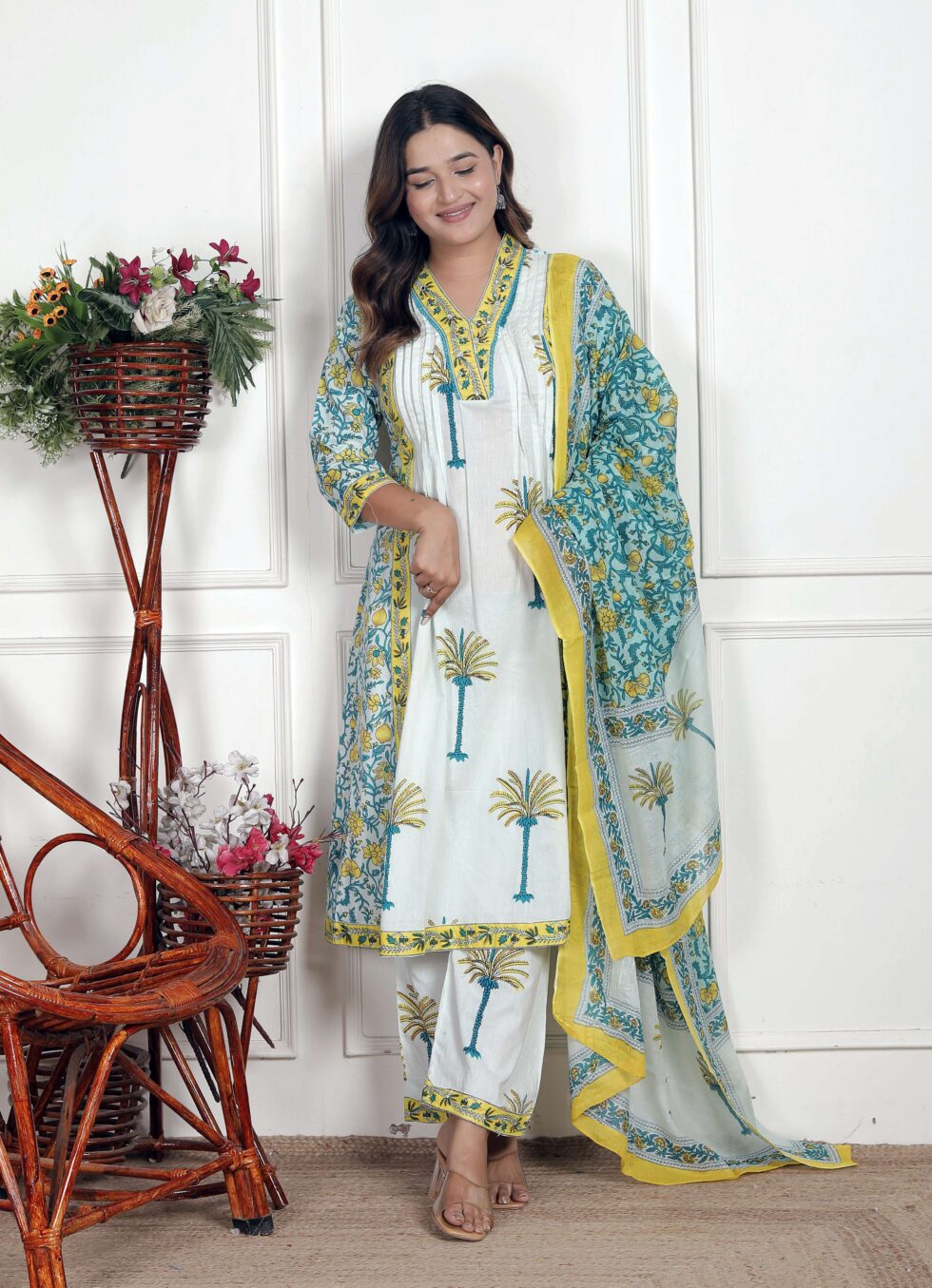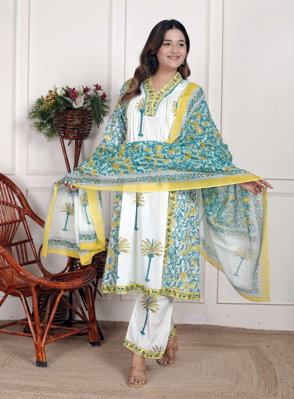 Women’s Cotton Printed Straight Kurti With Pant and Dupatta Set (White Aqua Blue)