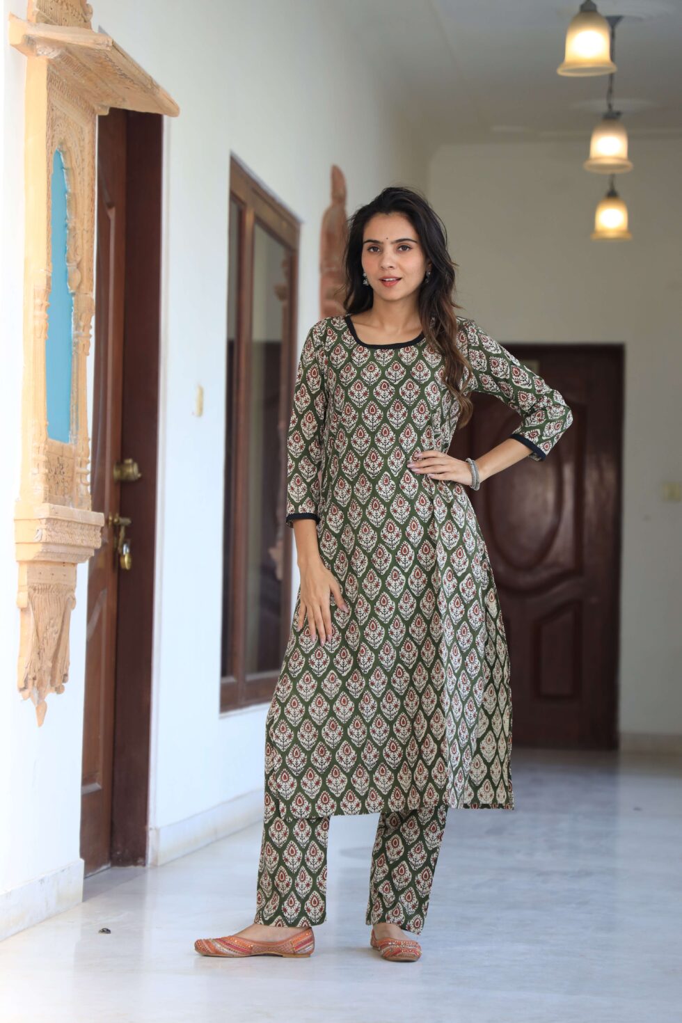 Elegant Green cotton kurta set featuring white handblock prints and a contrast patterned yoke. Perfect for office wear, festive occasions, or casual outings.
