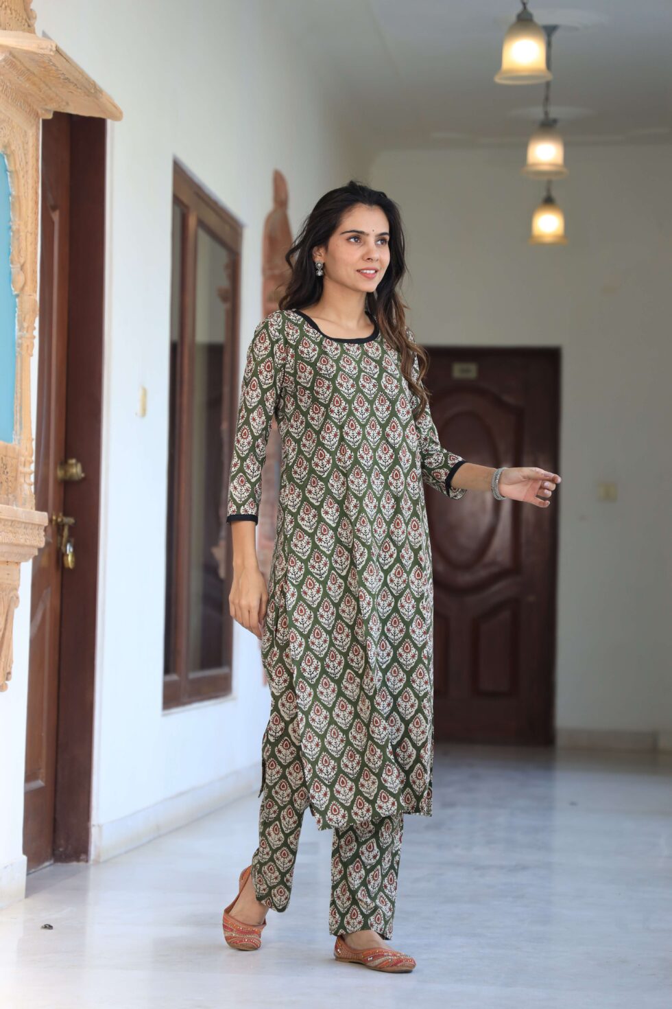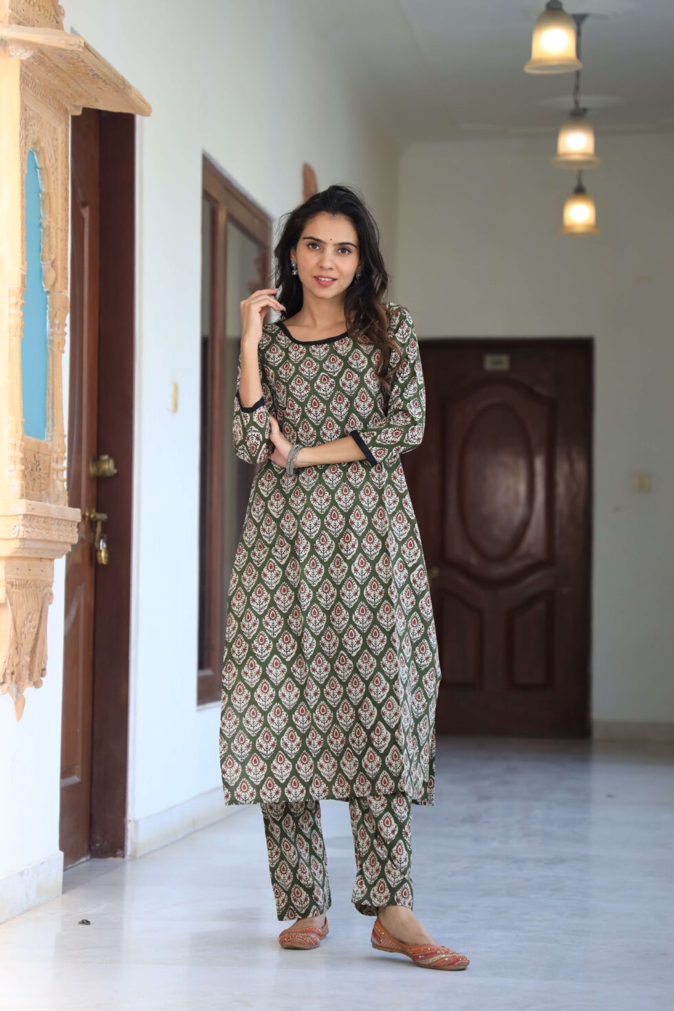 Green printed cotton kurta set, crafted for women who love a balance of tradition and modern style. The kurta features all-over white handblock-inspired circular motifs, paired with a contrast striped yoke design that adds a chic touch to the outfit. Designed with a straight fit and 3/4th sleeves, this set offers effortless comfort and sophistication. The breathable cotton fabric makes it perfect for daily wear, office dressing, festive events, and semi-formal gatherings. It comes with matching printed pants, ensuring a complete coordinated look.