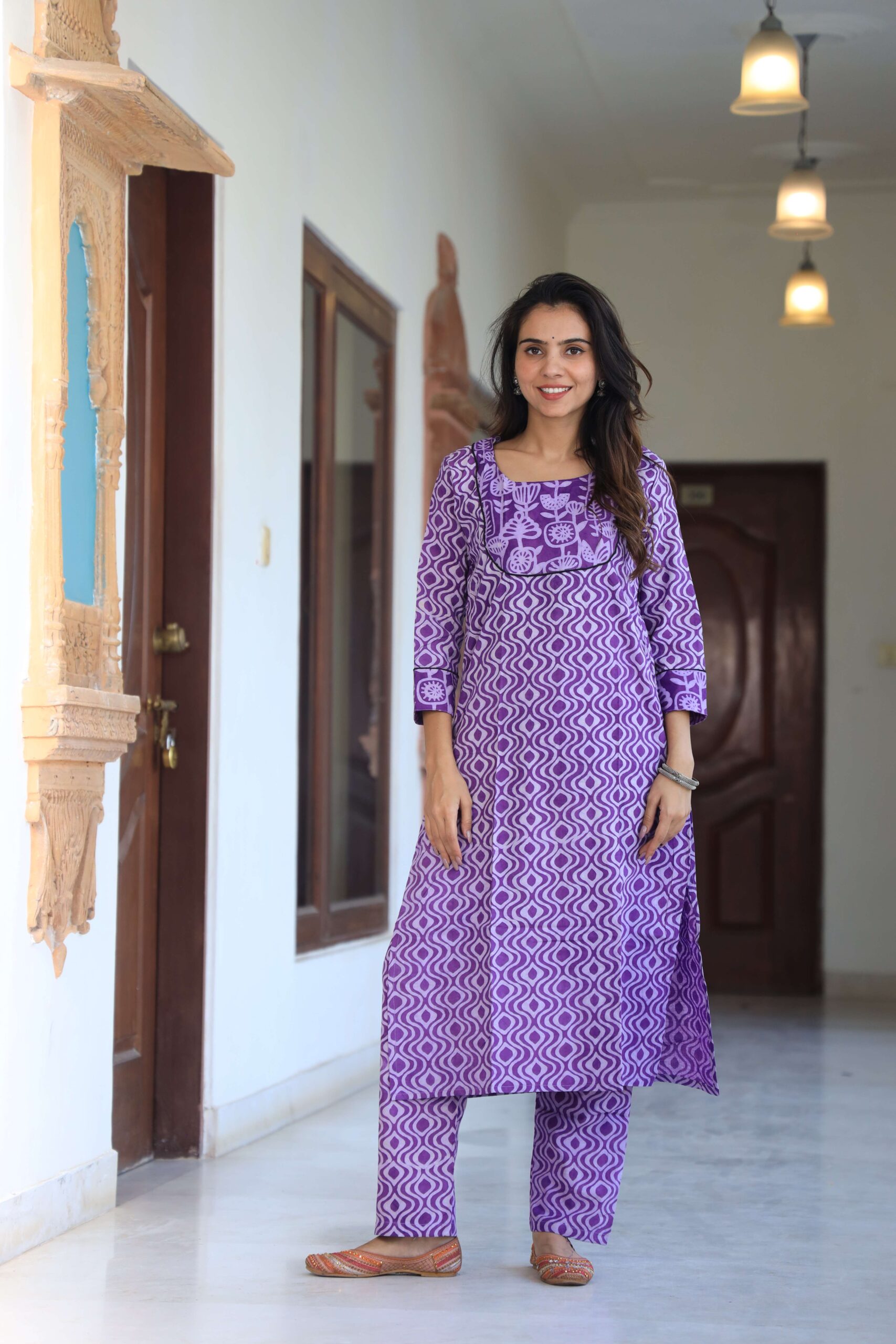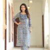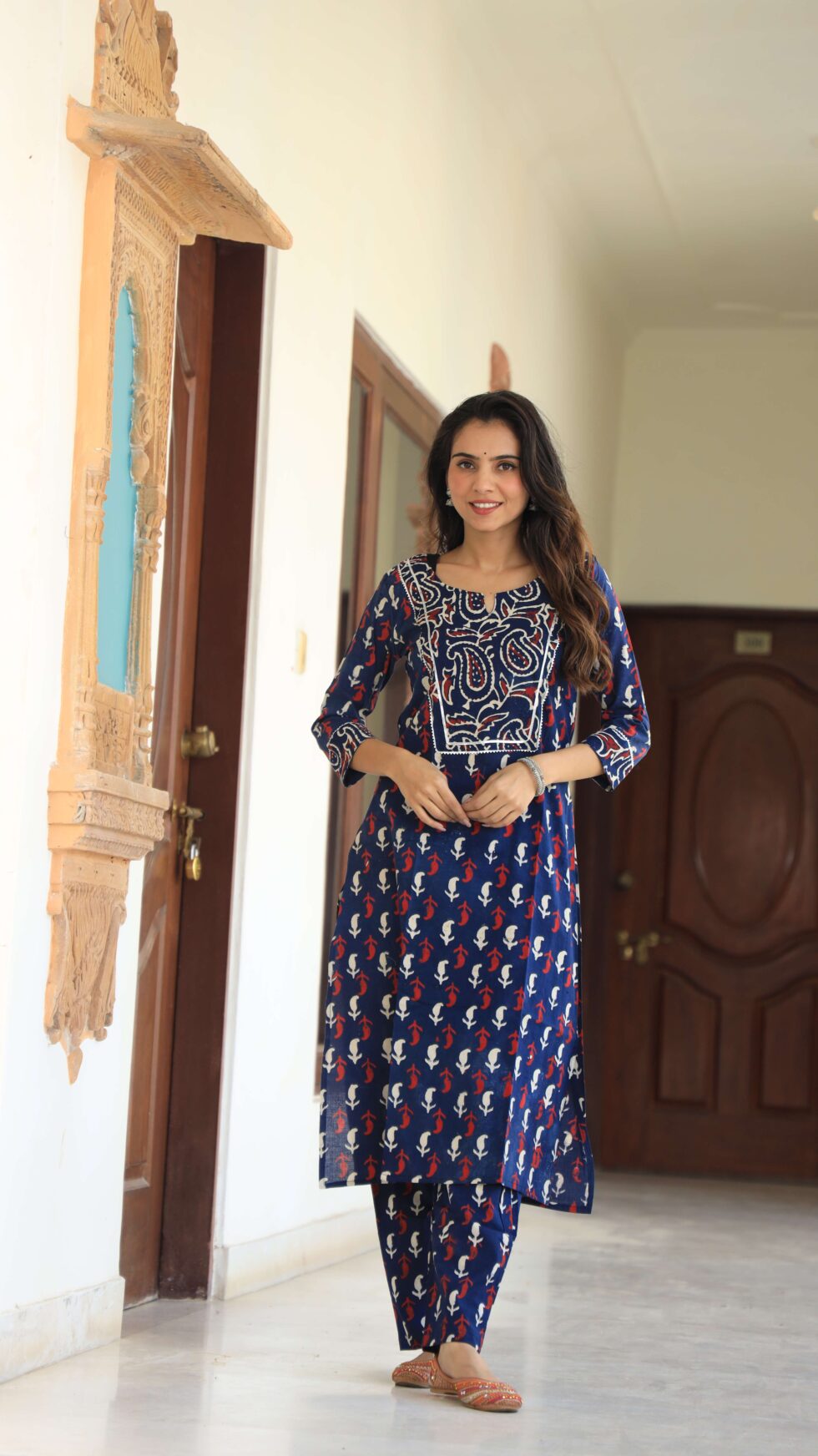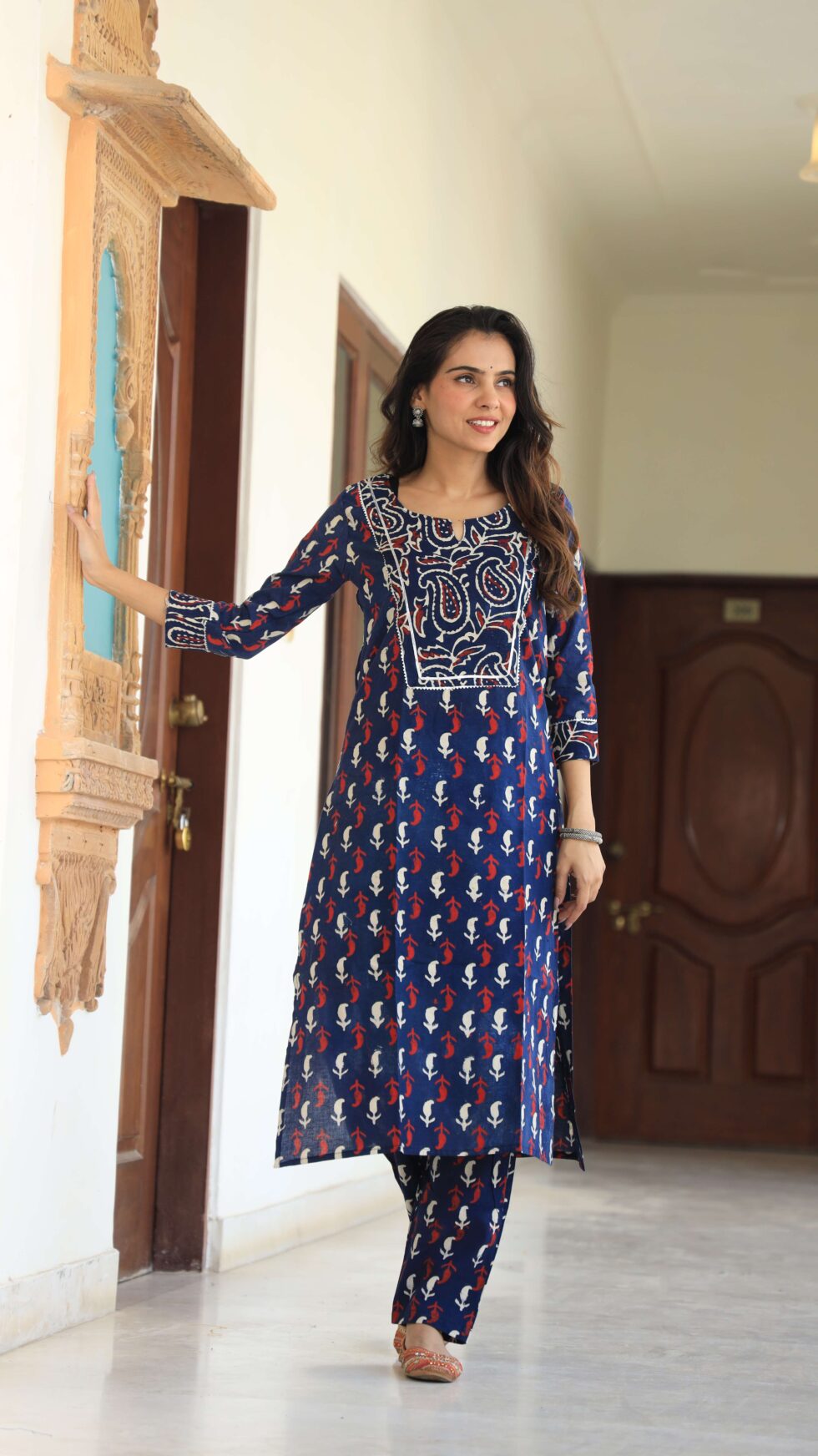 navy blue cotton kurta and pant set. The kurta comes with a beautifully designed paisley print yoke with contrast embroidery, giving it a traditional yet chic appeal. Its all-over multicolor print in red, white, and blue adds vibrancy, while the straight silhouette offers a comfortable and flattering fit. The breathable cotton fabric ensures all-day comfort, making it a versatile choice for daily wear, festive occasions, office meetings, and family gatherings.