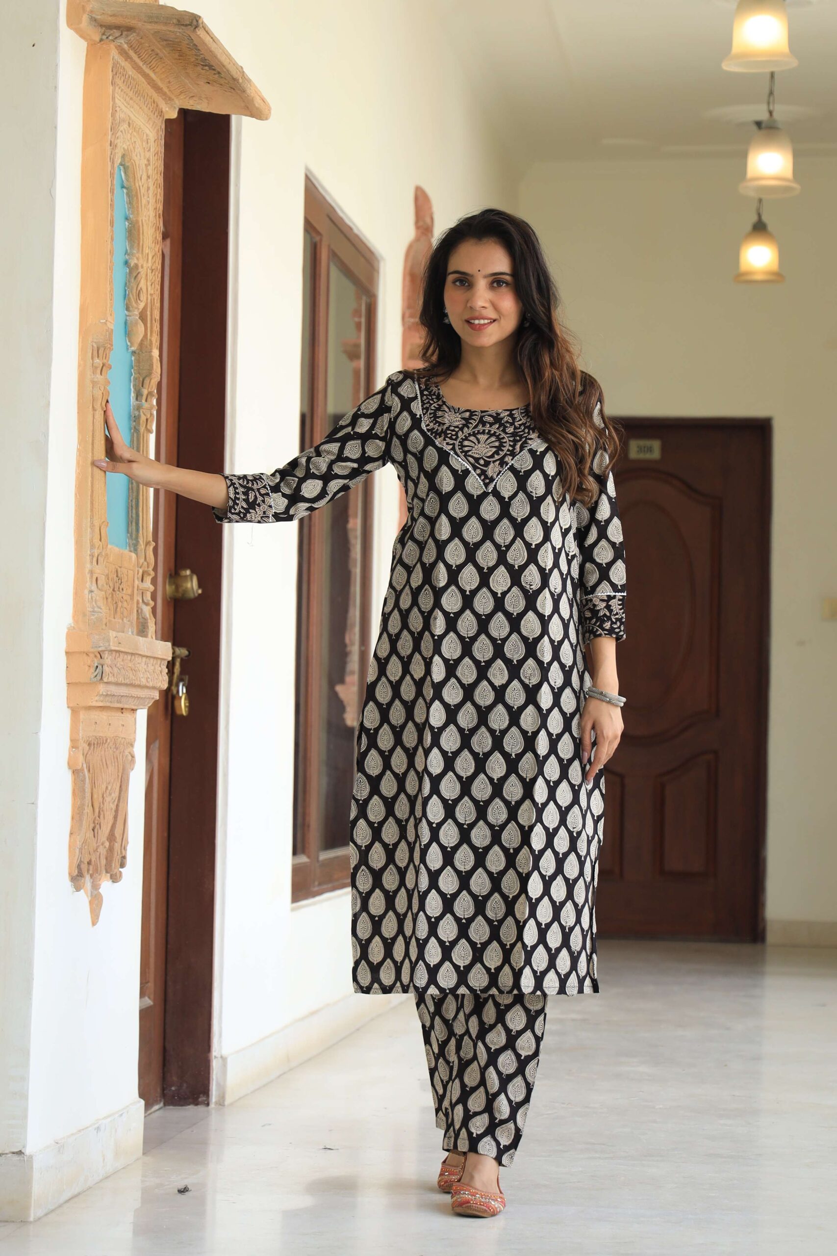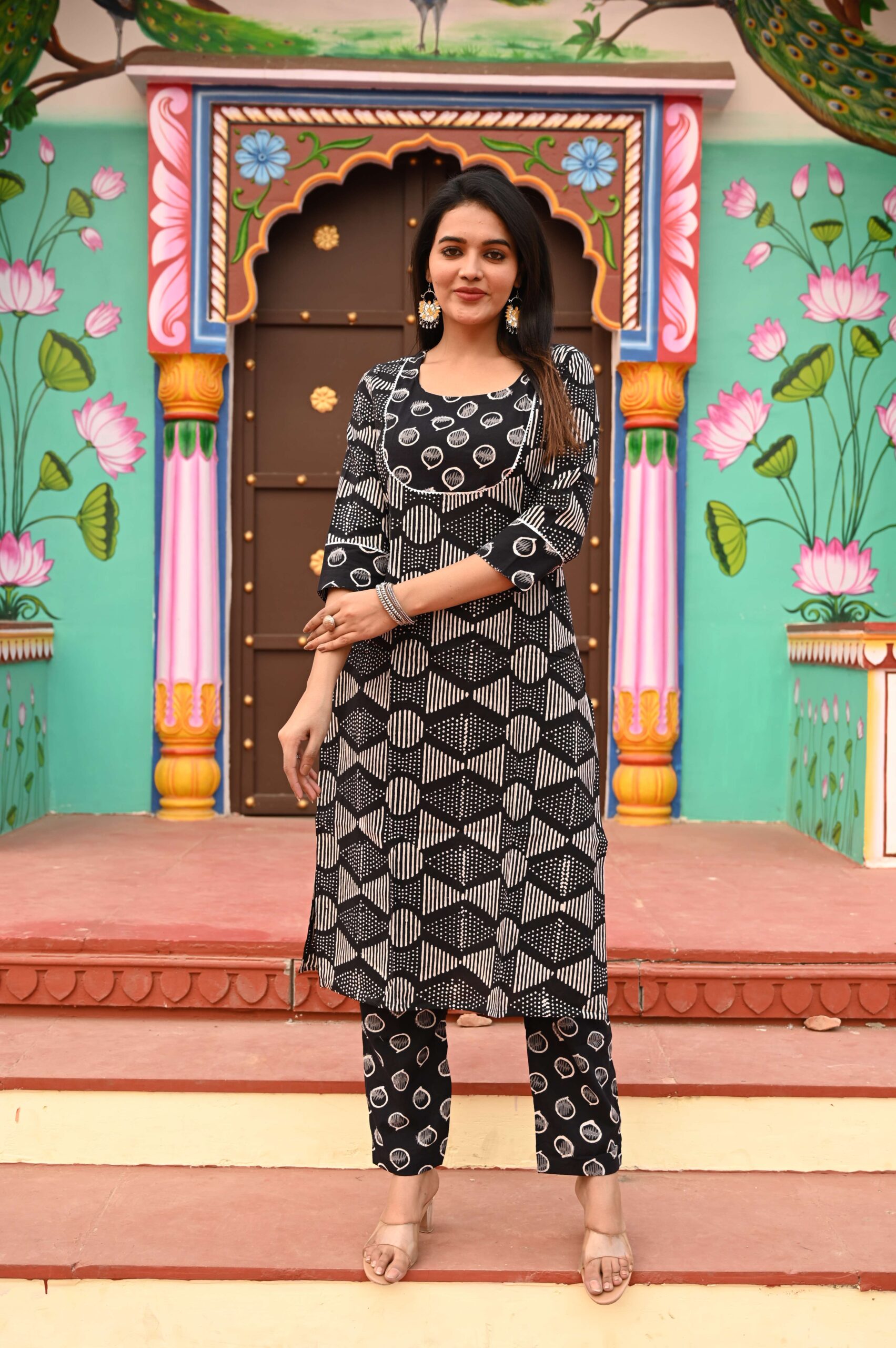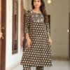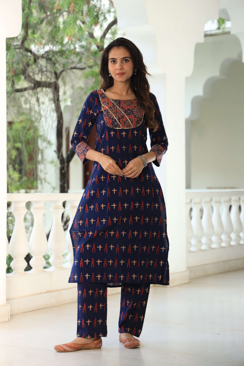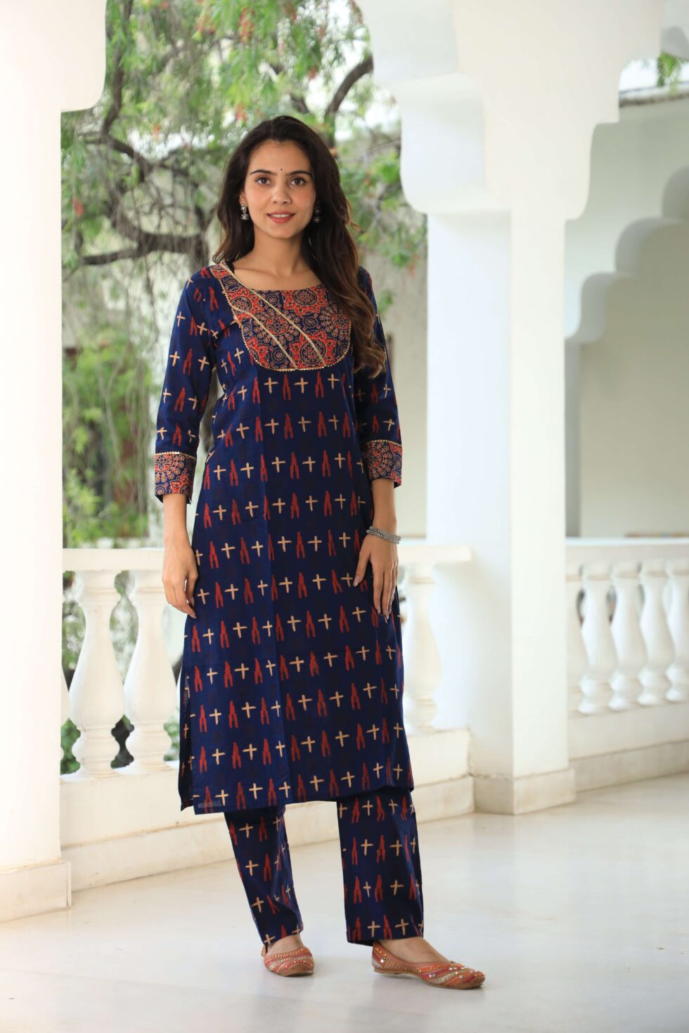 Navy Blue printed cotton kurta set, crafted for women who love a balance of tradition and modern style. The kurta features all-over white handblock-inspiNavy Blue circular motifs, paiNavy Blue with a contrast striped yoke design that adds a chic touch to the outfit. Designed with a straight fit and 3/4th sleeves, this set offers effortless comfort and sophistication. The breathable cotton fabric makes it perfect for daily wear, office dressing, festive events, and semi-formal gatherings. It comes with matching printed pants, ensuring a complete coordinated look.