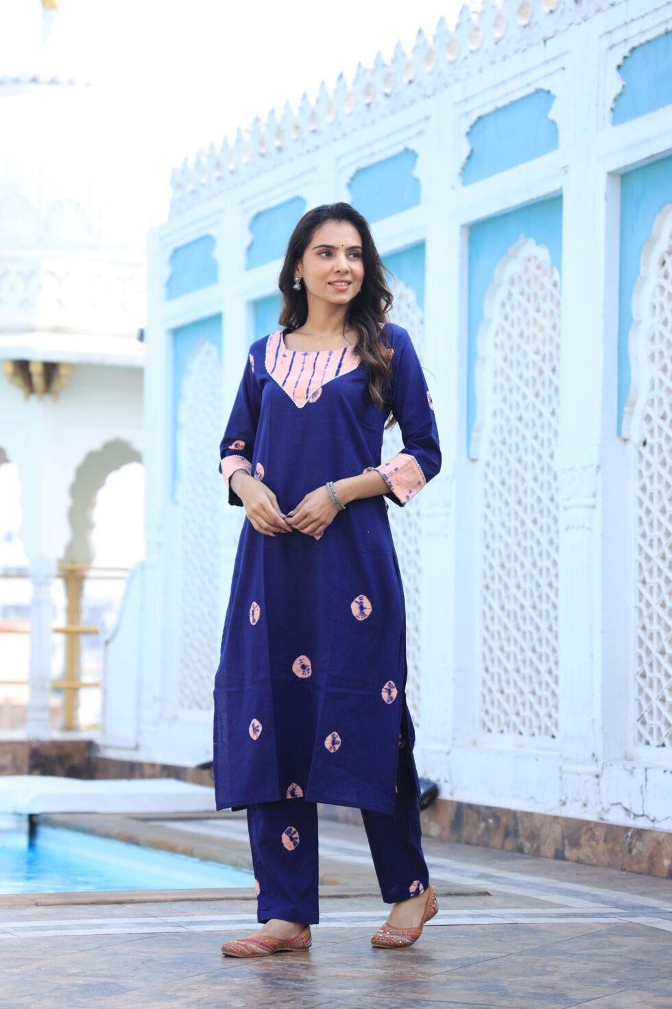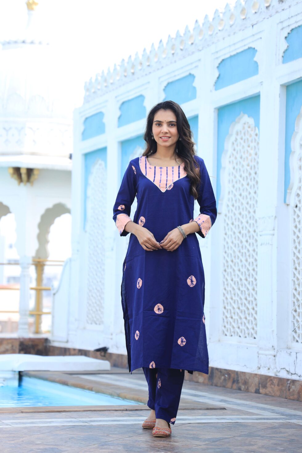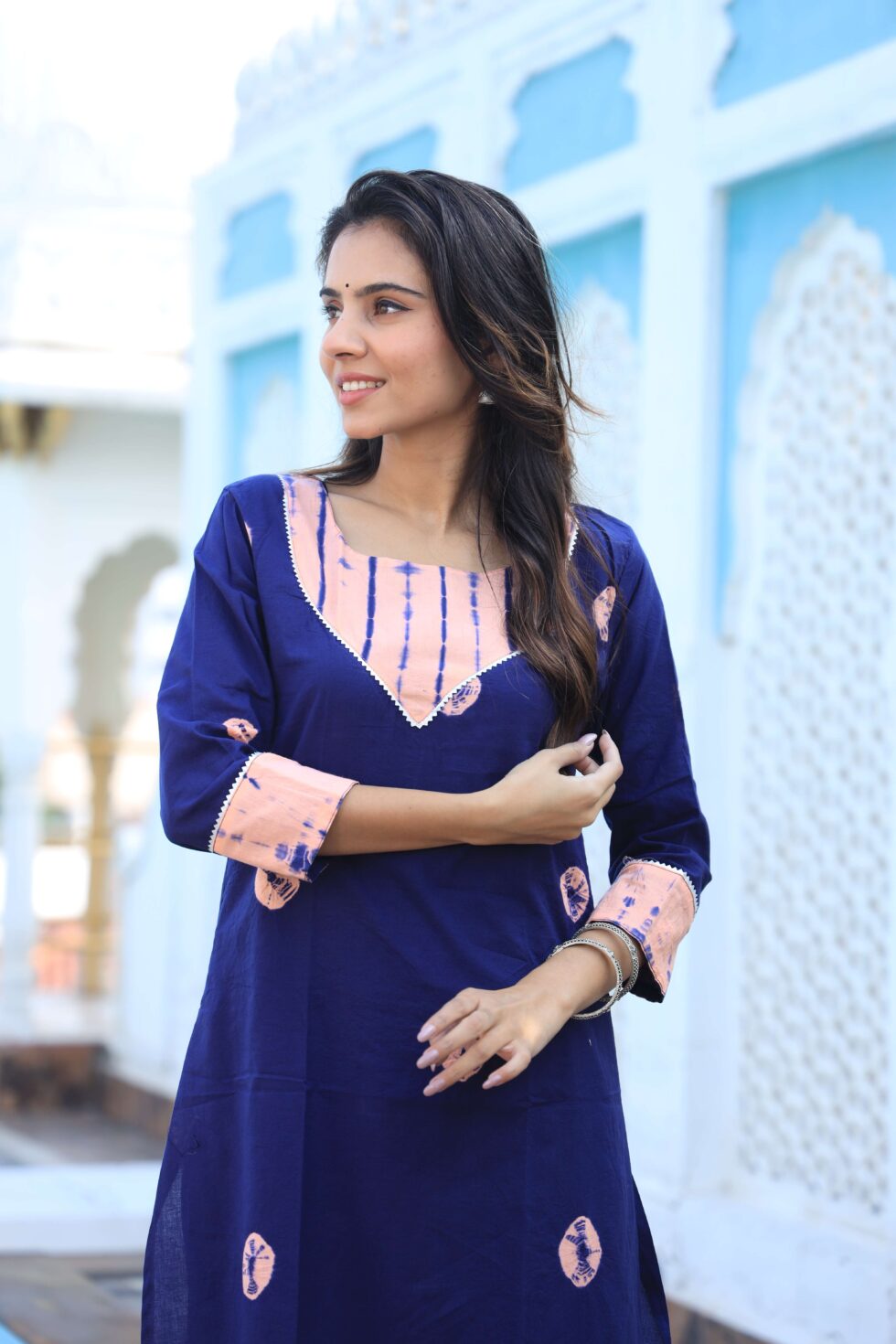 navy blue cotton kurta and pant set. Crafted from soft, breathable cotton, this kurta features delicate peach-hued printed motifs along with contrast detailing on the neckline and sleeves, giving it a refreshing and chic appeal. The straight-cut design ensures comfort and a flattering fit, making it a versatile pick for every occasion. The matching straight-fit pants complete the look, making it an effortlessly stylish outfit for office wear, festive gatherings, casual meetups, or everyday elegance.