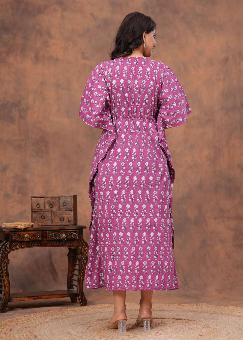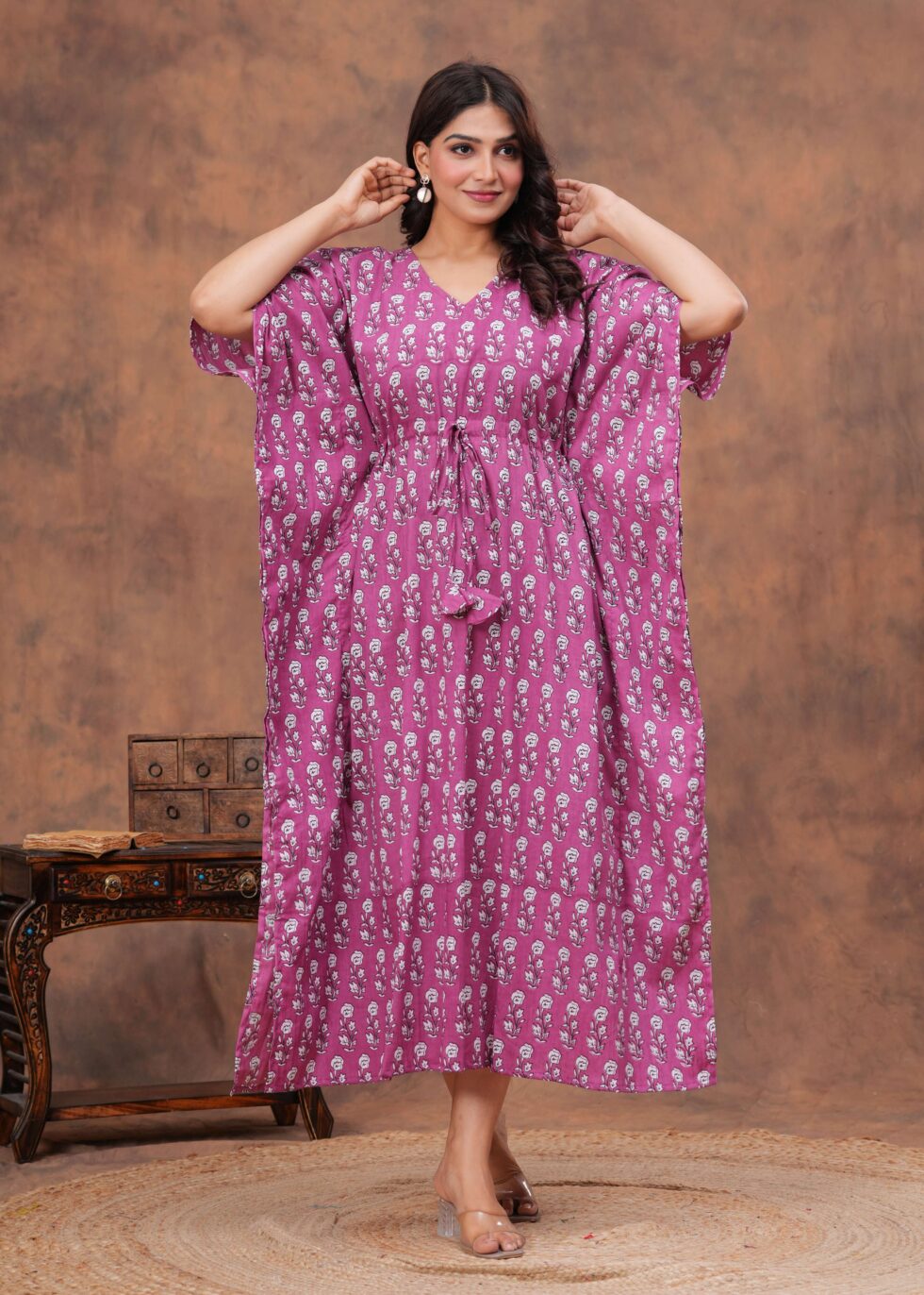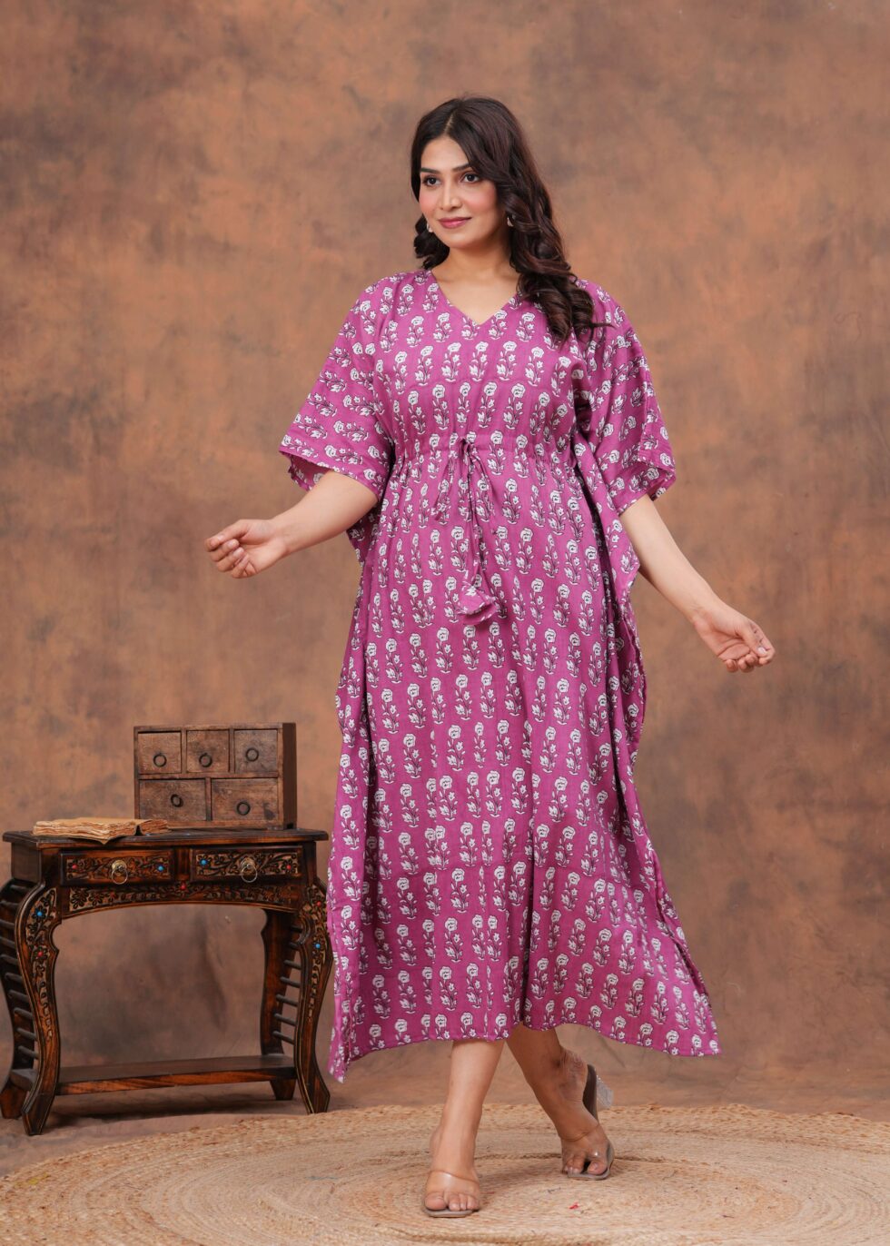 Stylish cotton kaftan dress with soft breathable fabric, adjustable drawstring waist, and relaxed fit. Perfect for casual outings, vacations, or lounging in comfort.