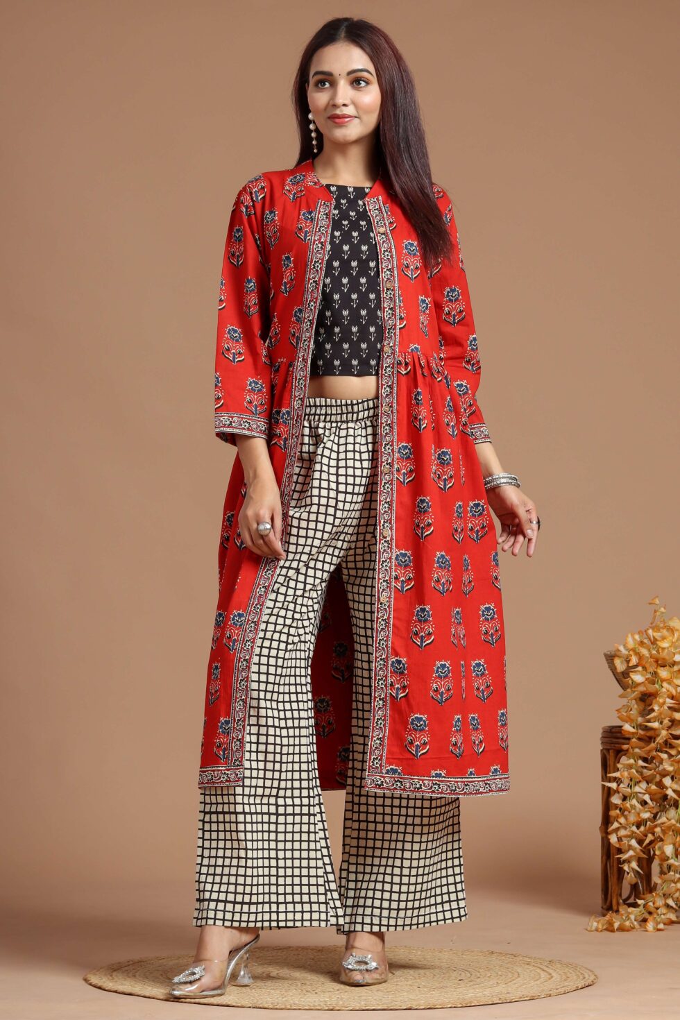 Handcrafted cotton shrug dress set with block prints, featuring a chic crop top, comfy palazzo pants, and an elegant shrug?perfect for festive occasions or casual outings.