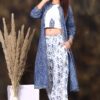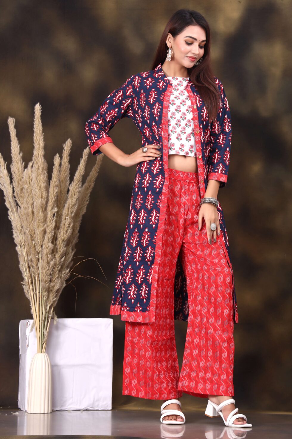 Handcrafted cotton shrug dress set with block prints, featuring a chic crop top, comfy palazzo pants, and an elegant shrug?perfect for festive occasions or casual outings.