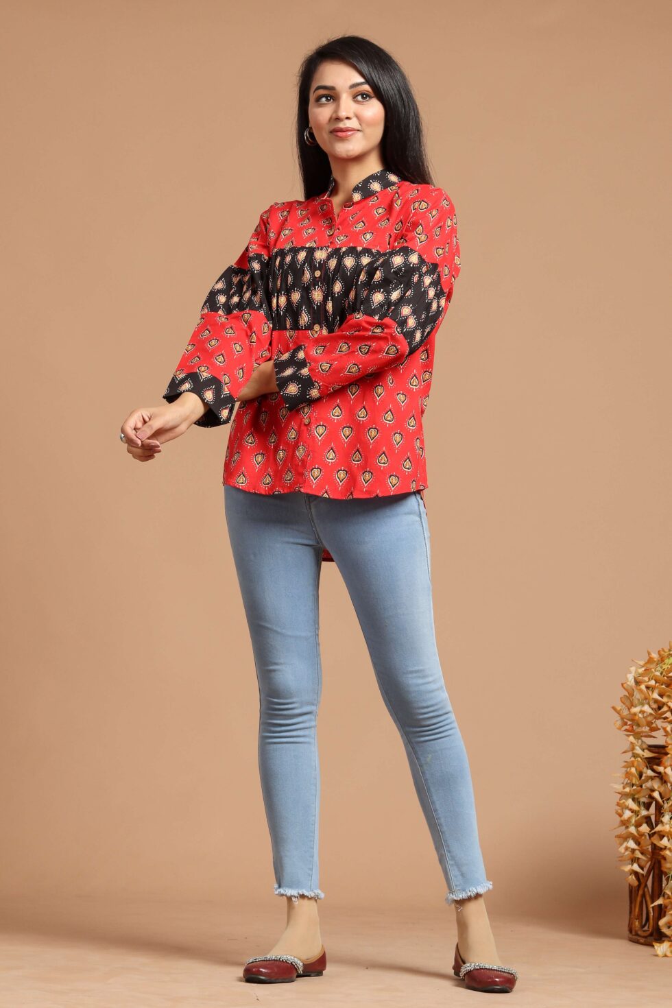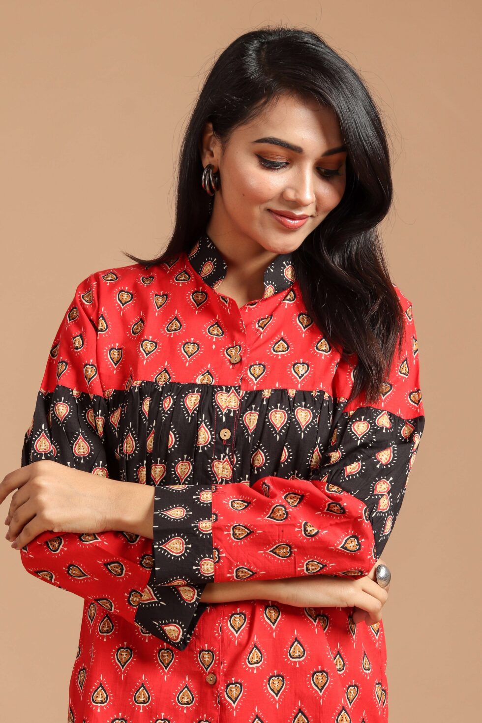 Red And Black floral printed cotton shirt-style top for women. Designed with a collared neckline, button-down front, and full sleeves, it offers a relaxed yet stylish look. The breathable cotton fabric makes it comfortable for daily wear, office meetings, or casual outings. Pair it with jeans, trousers, or skirts for a chic Indo-western vibe.
