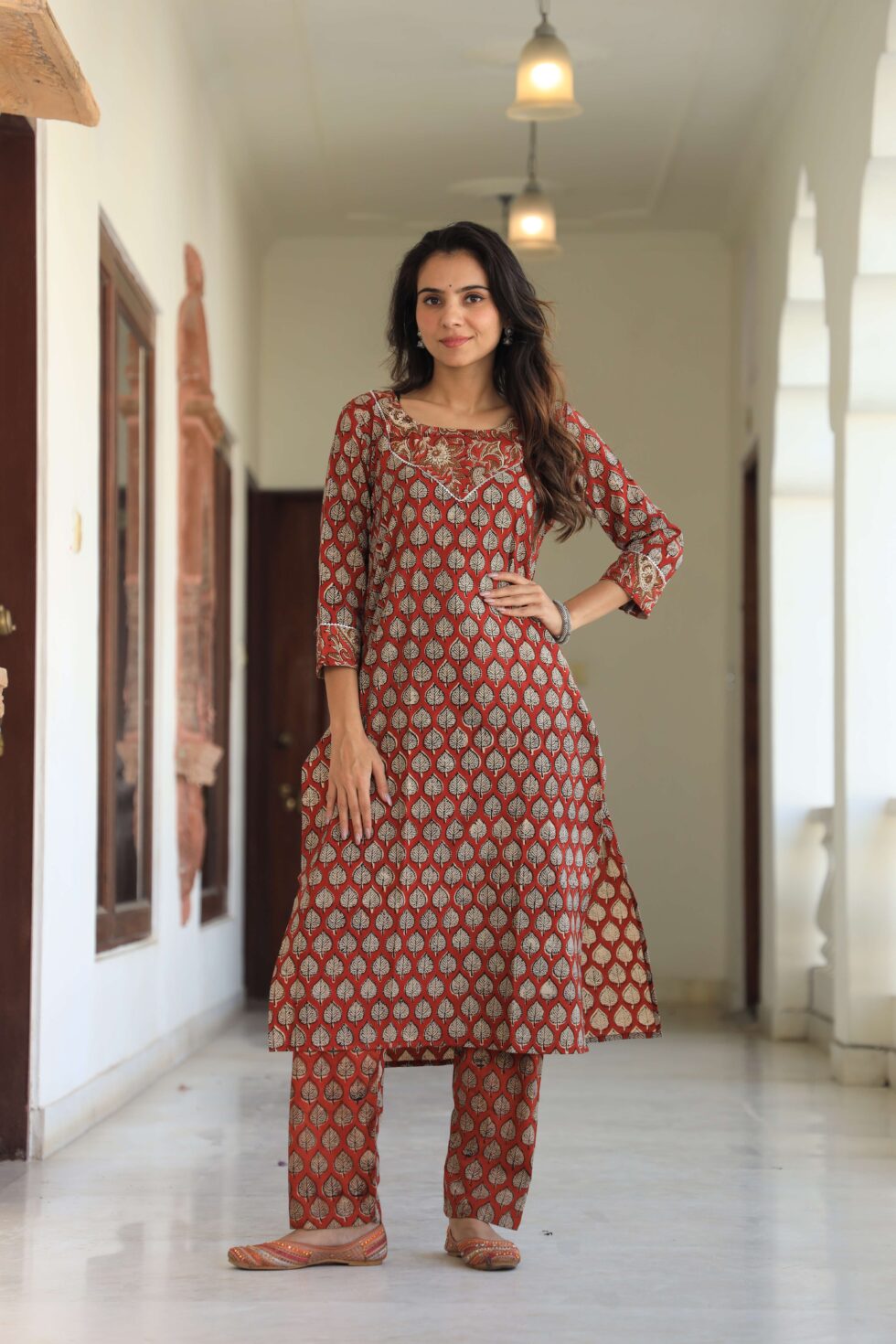 Elegant Red cotton kurta set featuring white handblock prints and a contrast patterned yoke. Perfect for office wear, festive occasions, or casual outings.