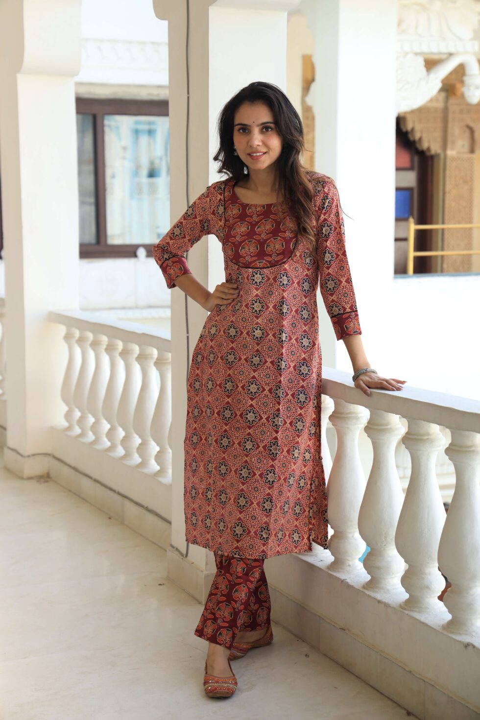 Elegant Red cotton kurta set featuring white handblock prints and a contrast patterned yoke. Perfect for office wear, festive occasions, or casual outings.