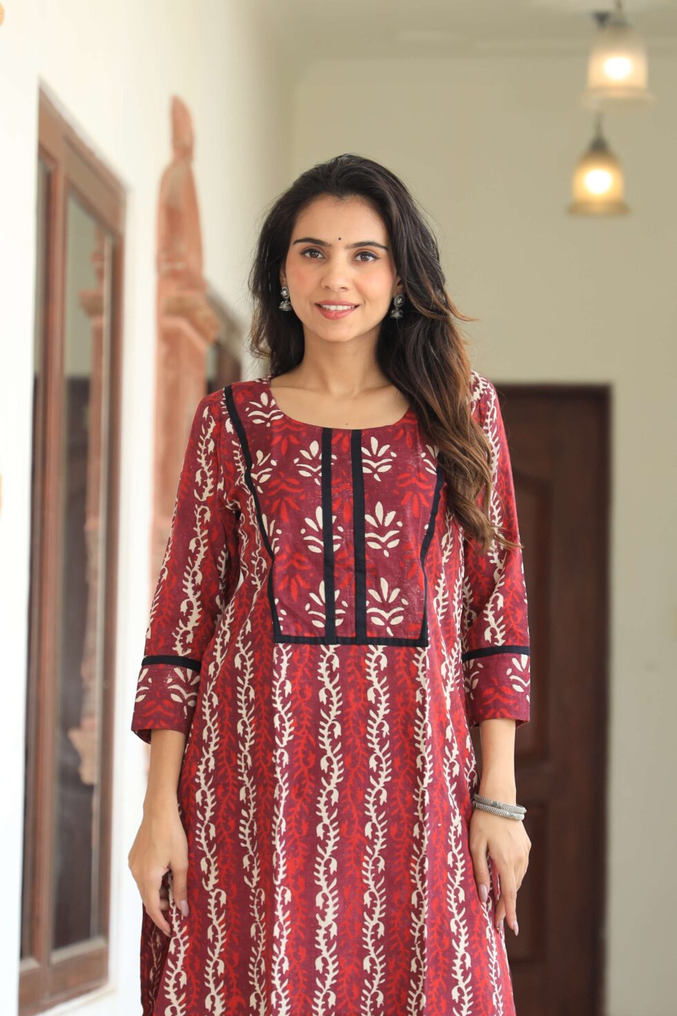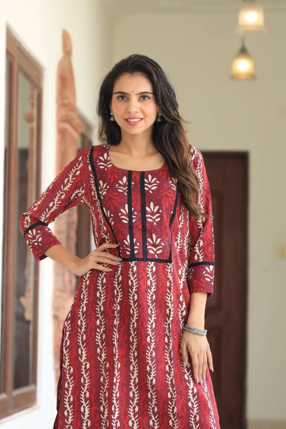 Elegant Red cotton kurta set featuring white handblock prints and a contrast patterned yoke. Perfect for office wear, festive occasions, or casual outings.