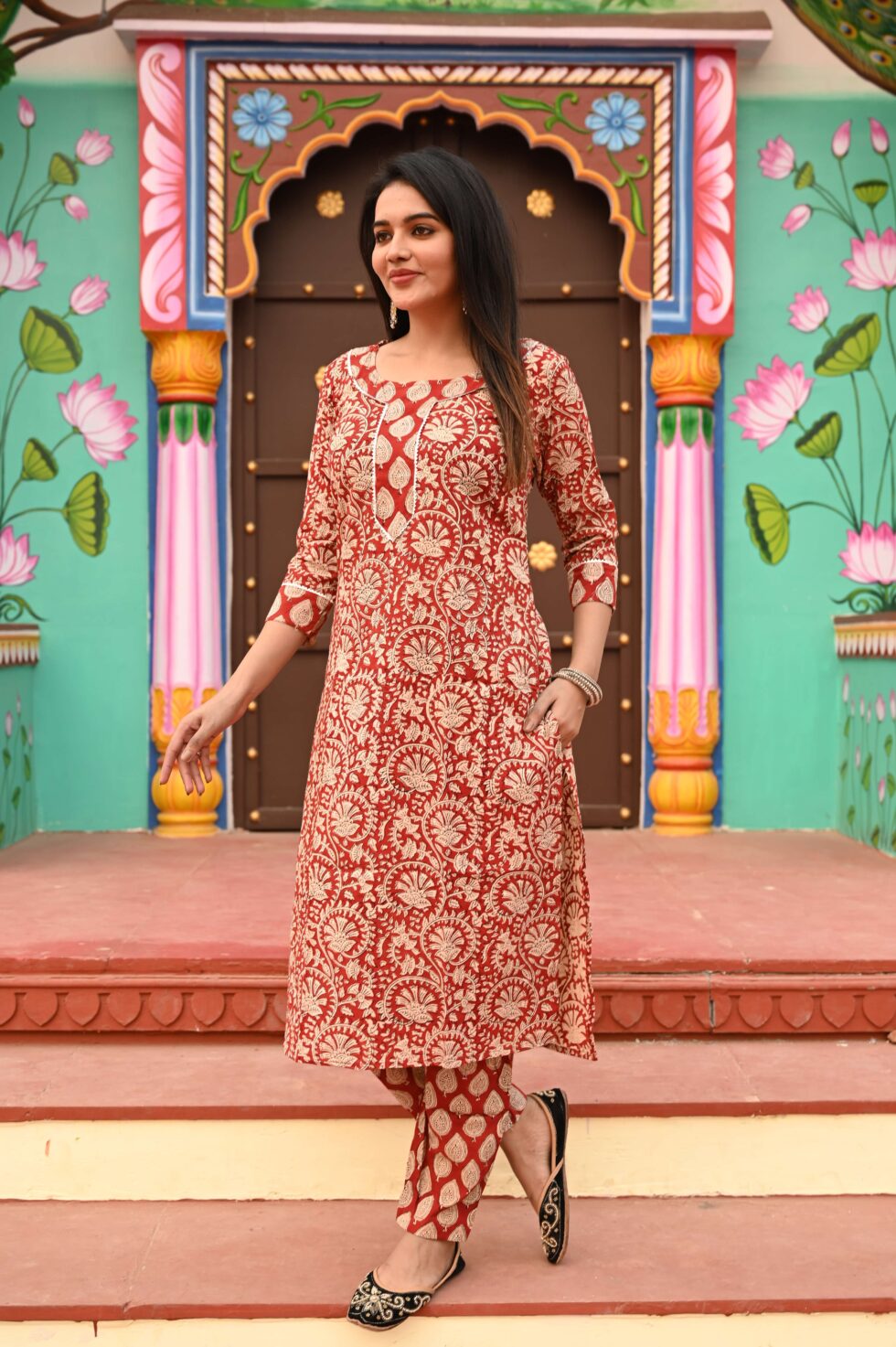Brighten up your wardrobe with this red cotton printed kurta set featuring matching pants and elegant neckline detailing. Perfect for casual wear, office meetings, festive events, and day-long comfort.