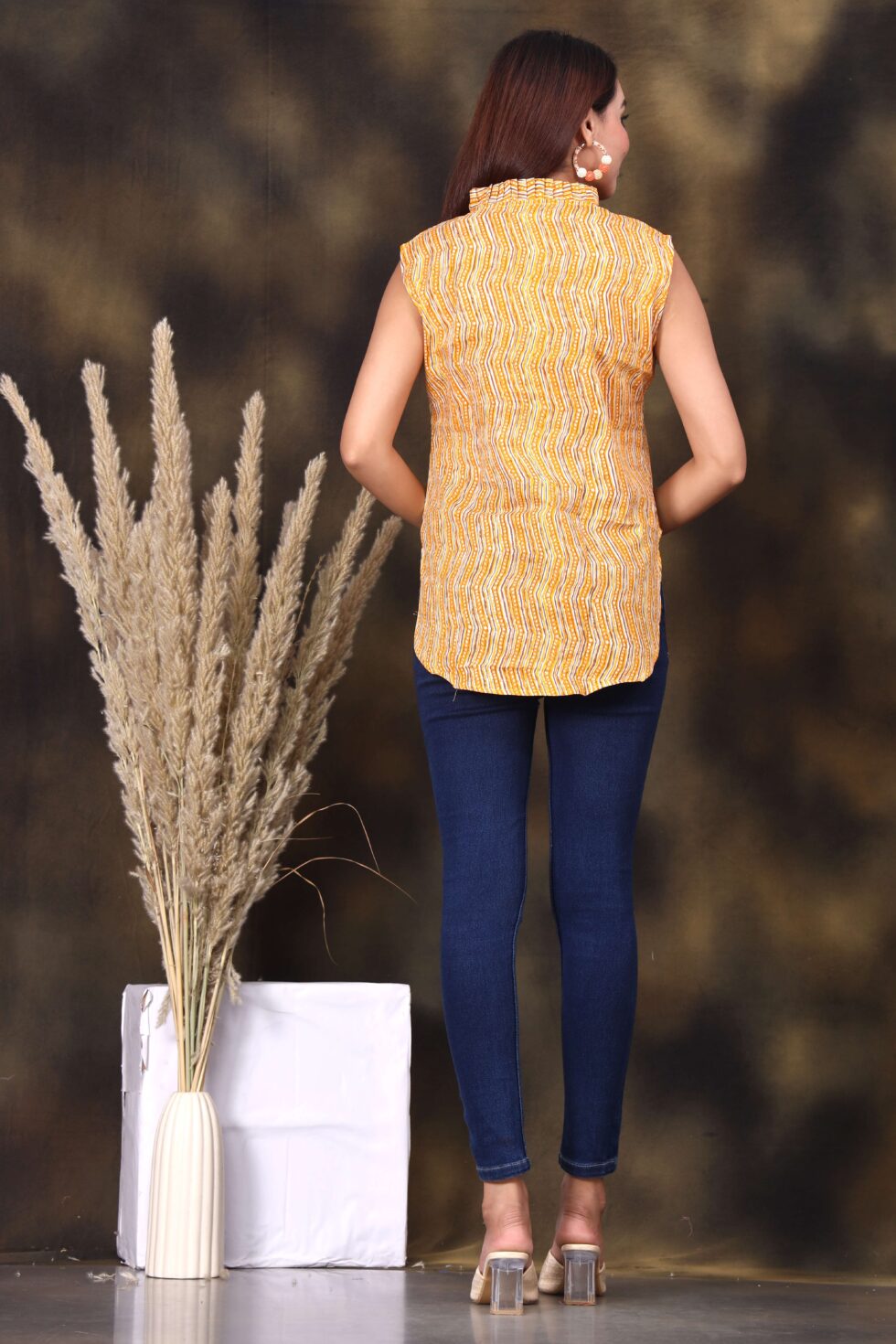 Yellow zigzag printed sleeveless top for women, crafted from soft breathable fabric. Featuring a trendy tie-up neckline with tassels, this modern top is perfect for casual wear, office styling, or weekend outings. Its monochrome pattern adds a chic touch, making it easy to pair with jeans, trousers, or skirts for a versatile look.